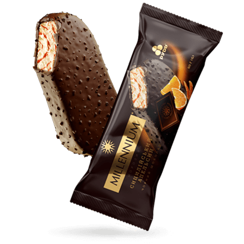 El helado de crema delicado del puré de naranja de Sicilia en chocolate negro con trocitos crujientes de granos de cacao. La frescura de los agrios y un amargor agradable de chocolate regalarán una delicia inolvidable a los golosos.